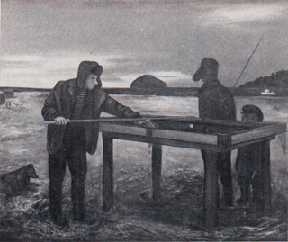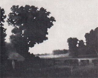 К экологической проблеме молодые пытаются подойти в аспекте ее сложных связей, сопряжений с другими зависимостями, а в общем в отношении к общественному самочувствию личности. Меняется характер поэтизации. По этой причине и возникают новые подходы к теме, как, к примеру Д. Григоровича. В его картинах «Лето», «На рассвете» природа наполняется каким-то загадочным смыслом, мистическими отблесками. Кажется странным бледно розовый рассвет на темно-синем небе. Кажется, что время замерло, остановилось в ожидании очередных «чудес» природы. Художник вносит в изображение романтические ноты, символические звучания. Такой ансамбль взаимоотношений порождает новый образ, резко отличный от натуроподобной традиционности и сопряженный с иными общественно-этическими проблемами. В то время как укрепилось сухое, иллюзорное письмо, возникла ностальгия по сочному, богатому колоризму. В. Костин отметил отсутствие внимания к выразительным потенциям живописи. Но, по-моему, говорить об отсутствии колоризма не совсем правильно. Собственно колоризм сохранился, но в другом выражении. Ежели ранее он был предметно-натурный, то сейчас как бы внепредметный, движимый авторскими эмоциями. Бледный сиреневый цвет в картине Г. Казимеренаса «Воскресенье» или плотный зеленый цвет Л. Пурмале в «Вечере», «Перегоне скота», «Болоте» свидетельствуют о новом уровне колористических забот художников, новом его качестве, возникшем в иной системе художественного мышления.