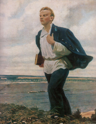 Юность В.И.Ленина 1950 Холст, масло Убедительный образ Ленина юноши воплотил в этой картине художник Прагер. Это полотно одна из наиболее серьезных работ о юности великого вождя, созданных советскими живописцами. Долго работал художник над волновавшей его темой, не один раз выезжал он в Ульяновск на родину Ильича. Собранный В. И. Прагером большой натурный материал многочисленные этюды Ульяновска и окружающих его живописных приволжских мест, которые с детства знал и горячо любил Володя Ульянов, помогли художнику полнее представить образ Ленина в гимназические годы. Прекрасная русская природа широкая гладь Волги, залитые солнцем песчаные отмели, зеленые дали и юноша в светлой рубашке с книжками под мышкой, легко взбегающий на крутой берег. |